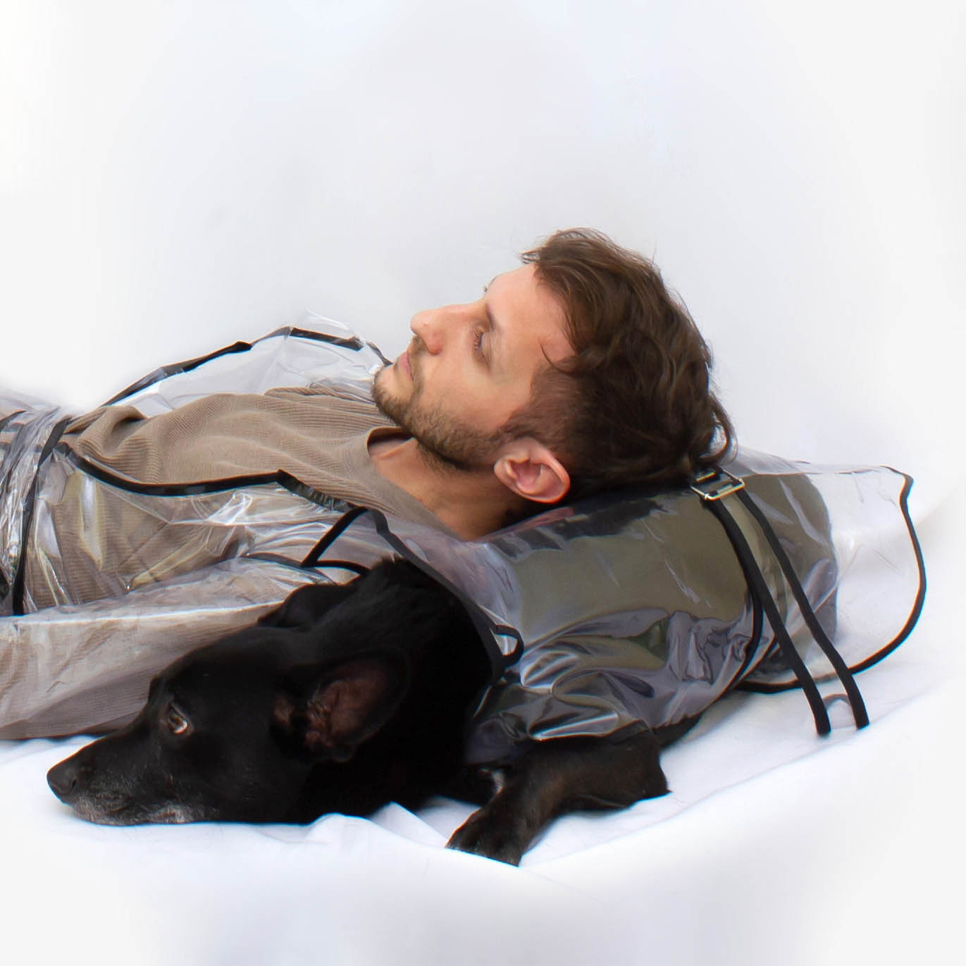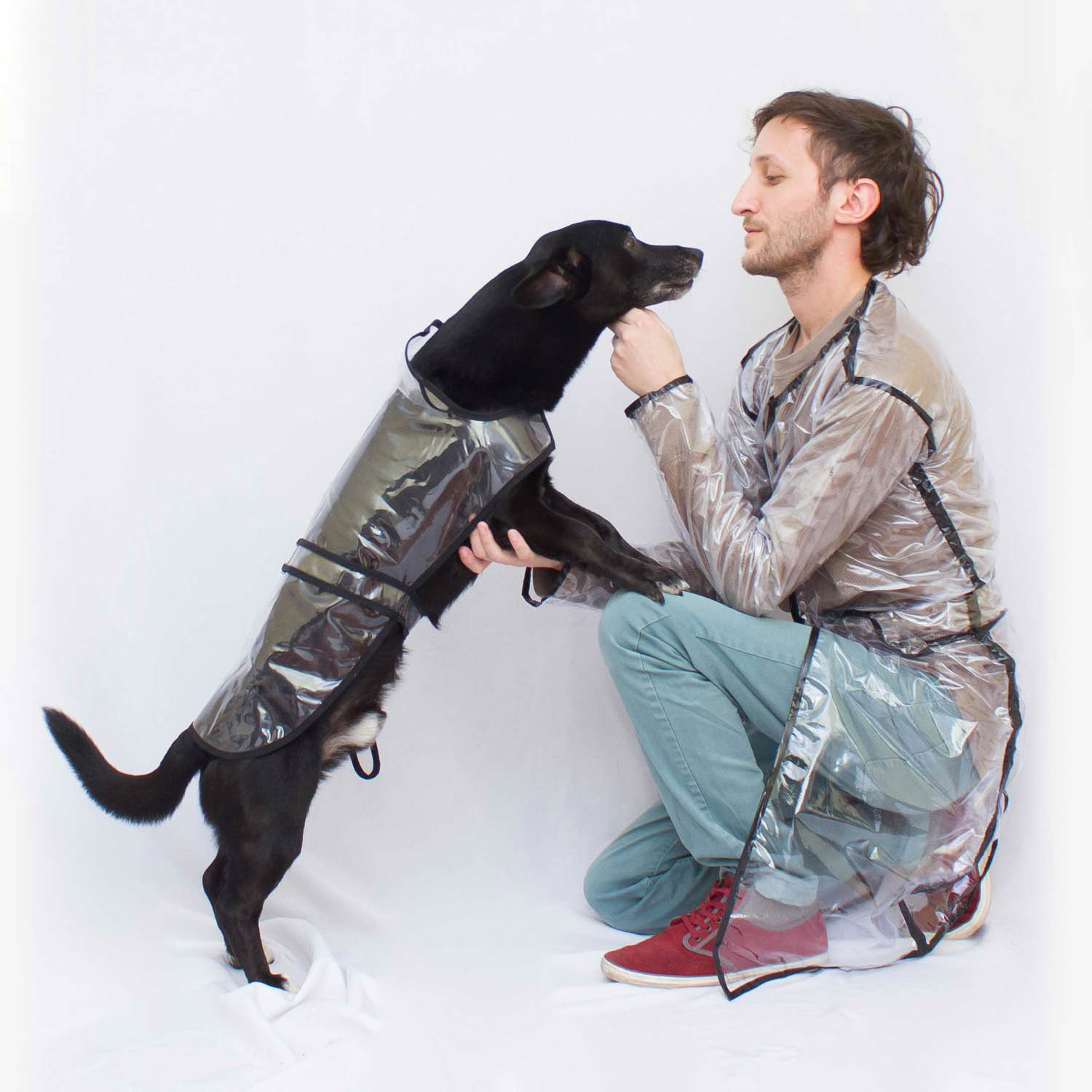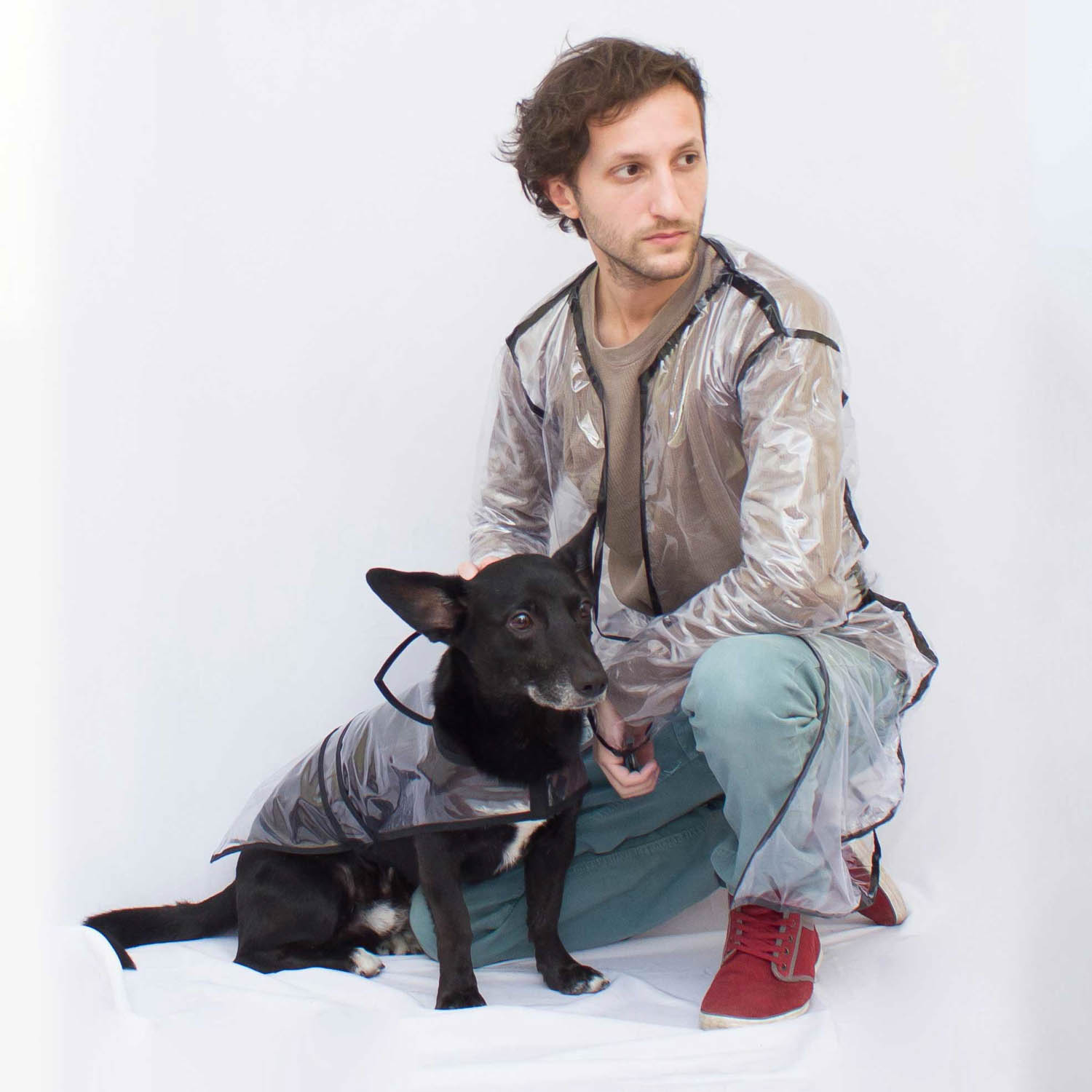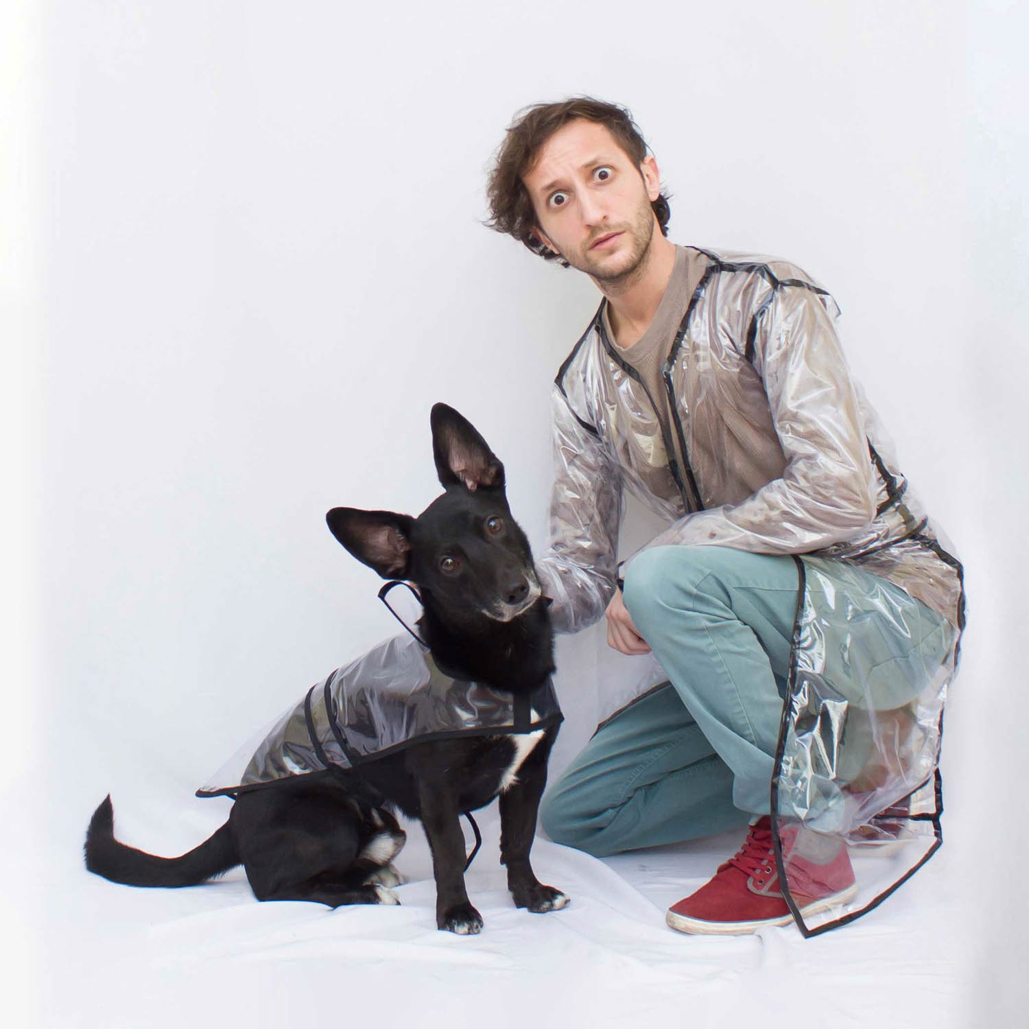 Un día de lluvia le compré un piloto para poder pasearlo sin que se moje y quedé enamorado de cómo le quedaba, con ese cuellito y ese cinturoncito. Por eso decidí armarme un piloto similar al suyo y busqué en Internet hasta que conseguí 2 metros de tela de plástico PVC cristal. Con eso, una abrochadora y cinta aisladora negra, pude hacer este piloto de lluvia moderno, para poder estar a tono con el modelo original de Gannikus.