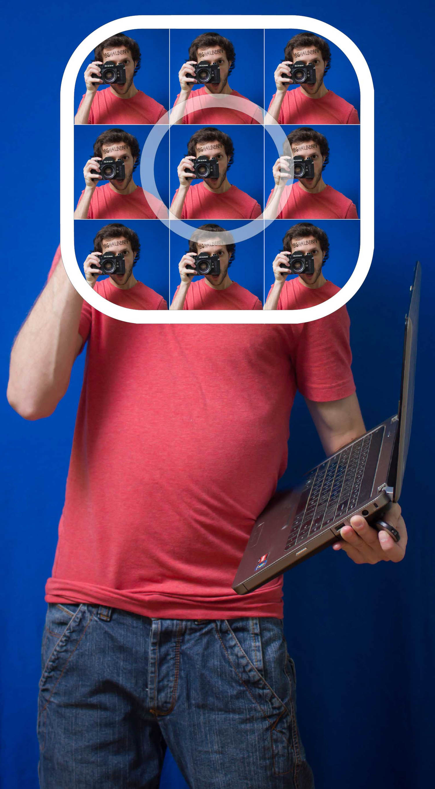 En esta foto quiero poner todo en la grilla, excepto la edición de las fotos, representada por mi laptop. Dentro de la grilla se puede ver un autorretrato con una cámara analógica y una marca de agua de mi Instagram escrita sobre mi frente.